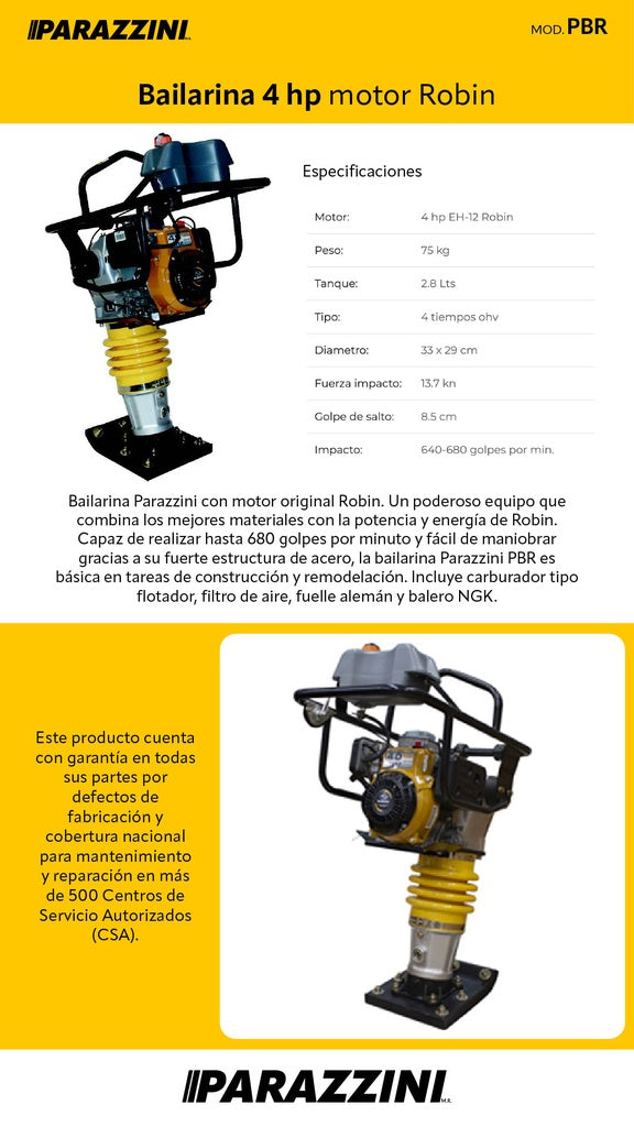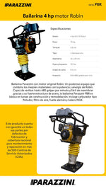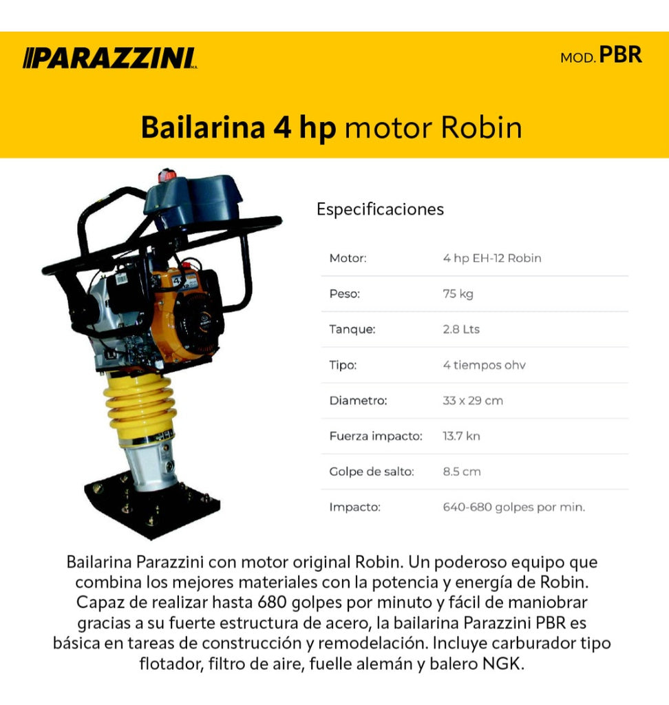 Bailarina compactadora de suelo de 4 HP con motor Robin Parazzini PBR, diseñada para compactación eficiente en proyectos de construcción y obra civil. Este equipo combina potencia y durabilidad, ideal para preparación de terrenos, bases de cimentación y trabajos de nivelación. El motor Robin garantiza rendimiento confiable y bajo consumo de combustible. Estructura robusta con placa de compactación de alta resistencia, perfecta para profesionales que demandan equipos de calidad industrial con excelente relación potencia-peso.