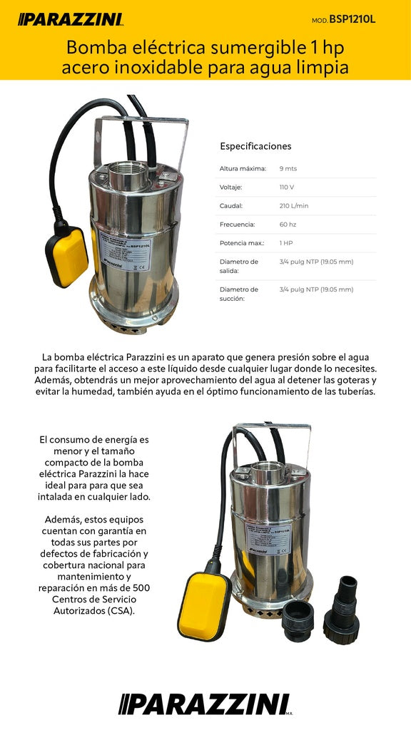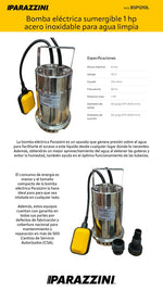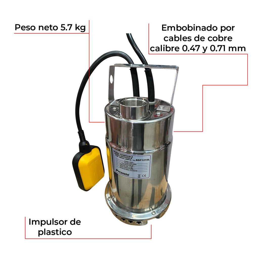 Bomba sumergible acero inoxidable 1 HP agua limpia Parazzini BSP1210L
