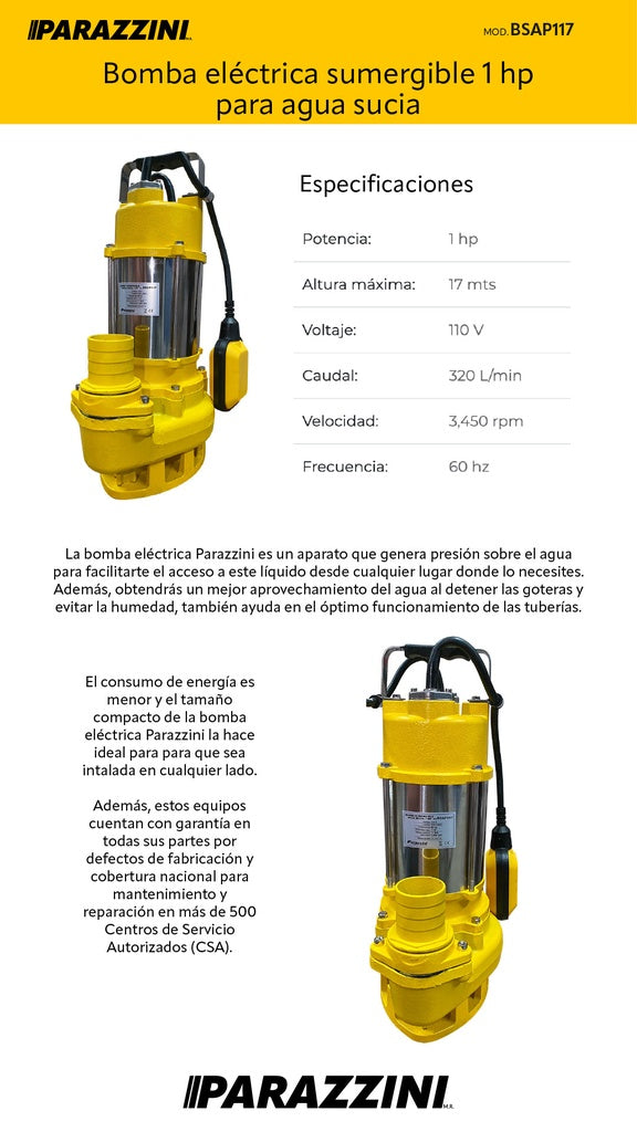 Bomba sumergible agua sucia 1 HP Parazzini BSAP117