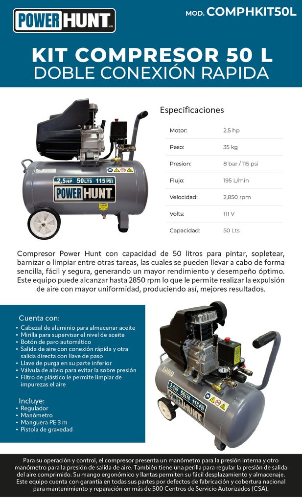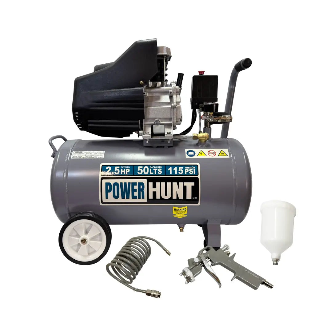 Compresor 2.5 hp 50 lts con doble conexión rapida kit de manguera y pistola de gravedad Power Hunt COMPHKIT50L