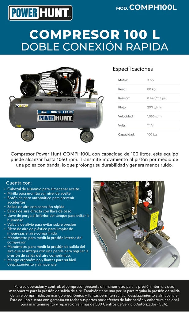 Compresor de aire profesional Power Hunt de 3 hp con tanque de 80 litros, diseñado para aplicaciones industriales y de taller. Cuenta con doble conexión rápida que permite conectar múltiples herramientas simultáneamente, optimizando la productividad. Incluye kit completo con manguera de alta resistencia y pistola de gravedad para aplicaciones de pintura y acabados. Motor potente que garantiza presión constante y desempeño confiable en trabajos continuos. Ideal para profesionales que requieren equipo robusto y versátil en sus operaciones diarias.