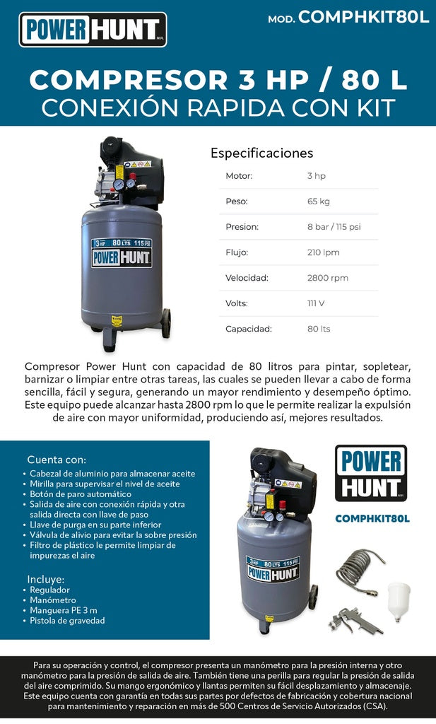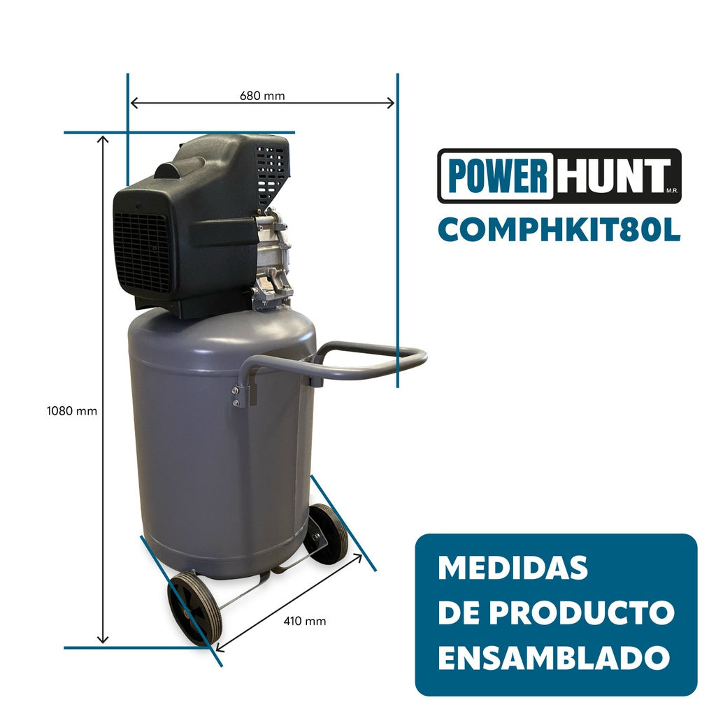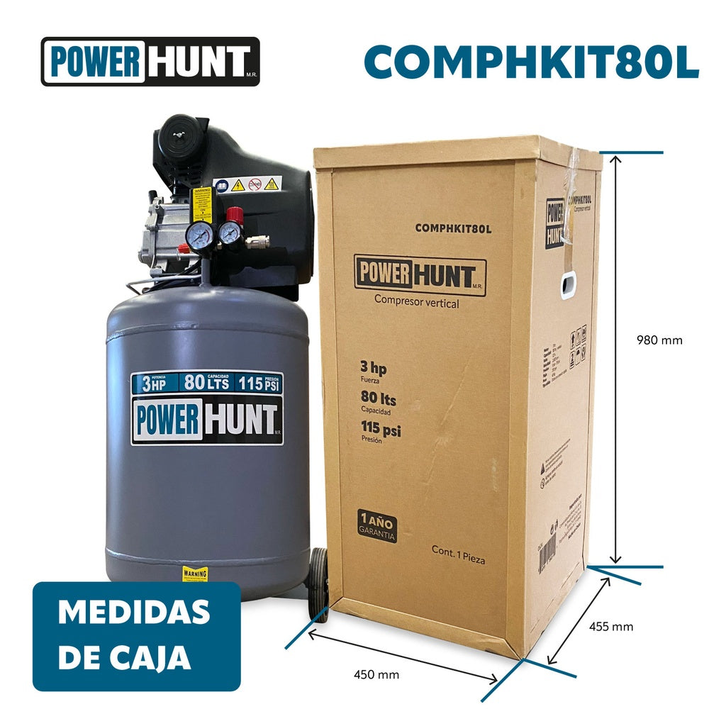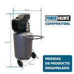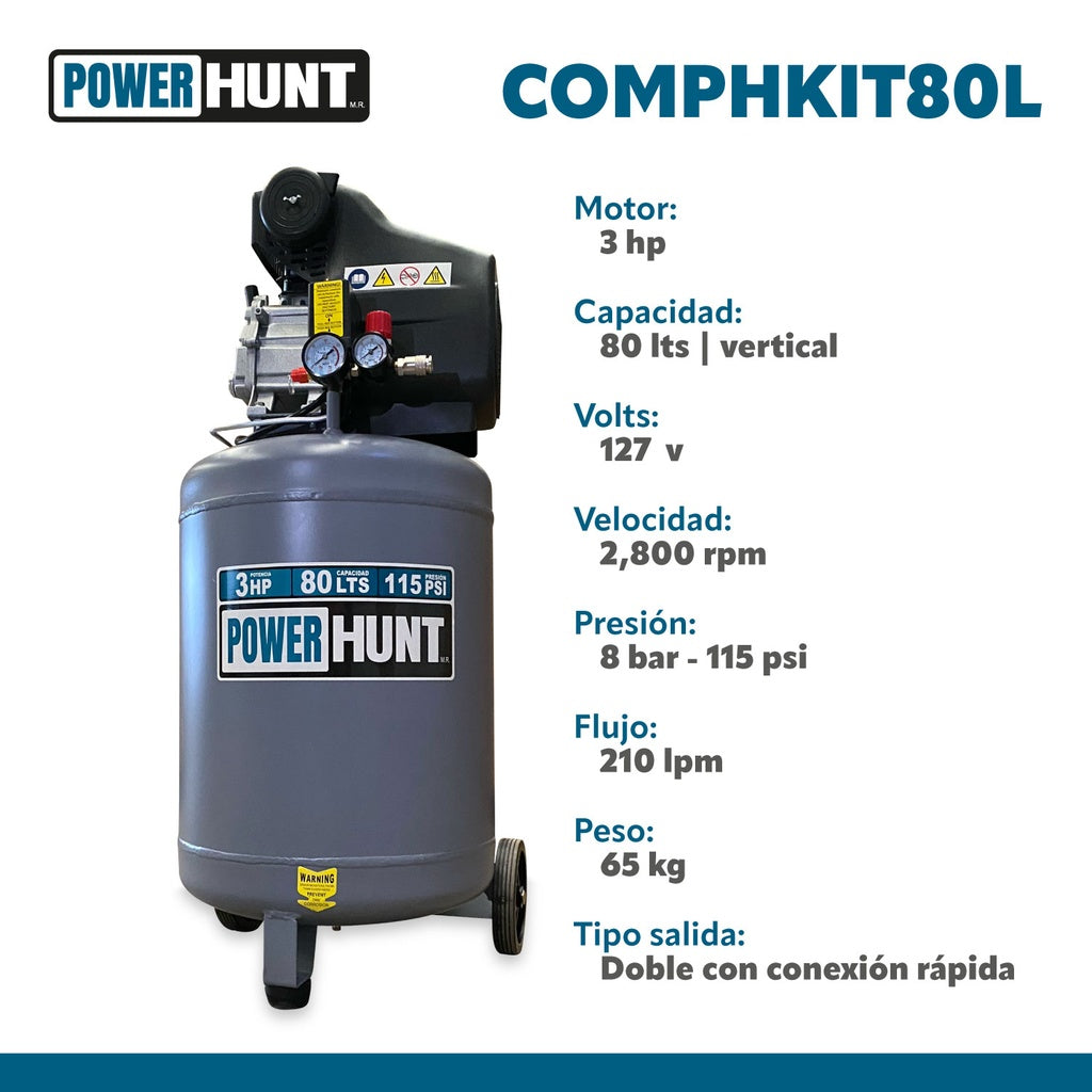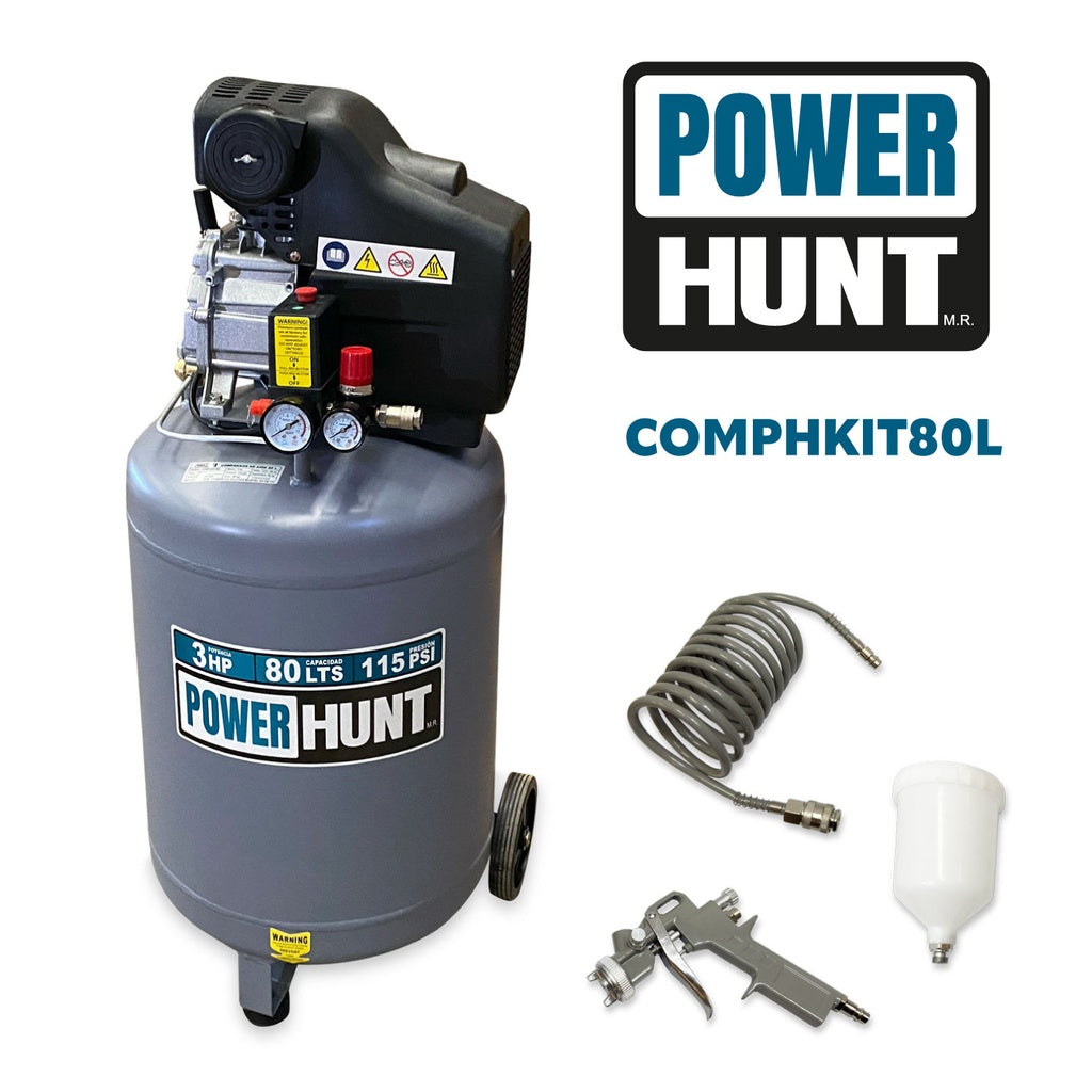 Compresor 3 hp 80 lts con doble conexión rapida kit de manguera y pistola de gravedad Power Hunt COMPHKIT80L