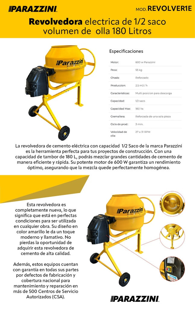 Revolvedora eléctrica Parazzini REVOLVER1E diseñada para mezclar eficientemente materiales a granel. Con capacidad de 180 litros, procesa hasta 1/2 saco de producto por ciclo, ideal para aplicaciones industriales y comerciales. Motor eléctrico de alto rendimiento garantiza mezclas homogéneas y consistentes. Estructura robusta y olla de gran volumen optimizan la productividad en operaciones de manufactura, construcción y agroindustria. Solución confiable para profesionales que requieren equipamiento de calidad.