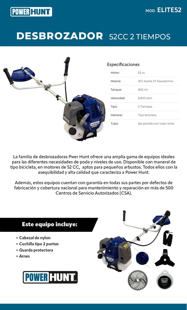 Desbrozador recto de 52 cc con cuernos y eje partido Power Hunt ELITE52