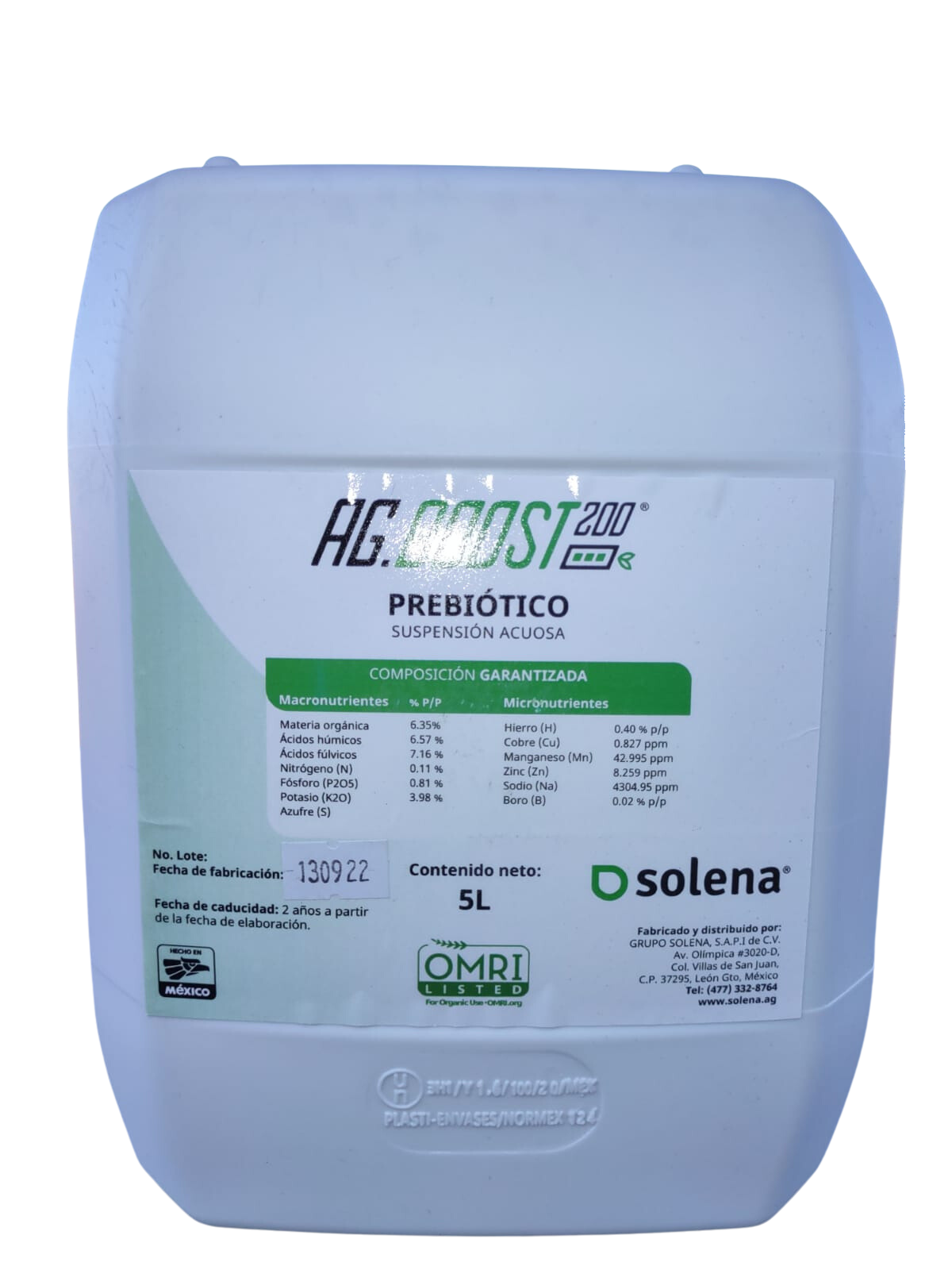 AG.BOOST 200® es un fertilizante orgánico para uso en las primeras etapas fenológicas del cultivo, contiene ácidos húmicos y fúlvicos que contribuyen al crecimiento radicular y a la retención de agua. Además, está enriquecido con micronutrientes: hierro, cobre, magnesio, zinc, sodio, boro y materia orgánica que aumenta la actividad microbiana en el suelo, contribuyendo a un mejor desarrollo de la planta.
