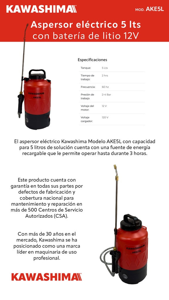 Aspersor eléctrico de 5 litros con batería de litio 12V de la marca Kawashima, modelo AKE5L. Diseñado para aplicaciones agrícolas y de jardinería, ofrece autonomía prolongada gracias a su batería recargable de litio de alto rendimiento. Su capacidad de 5 litros permite cubrir áreas extensas con una sola carga, reduciendo tiempos de recarga. Ideal para fumigación de cultivos, tratamientos fitosanitarios y aplicaciones de herbicidas. Construcción robusta y ergonómica para uso profesional y doméstico.