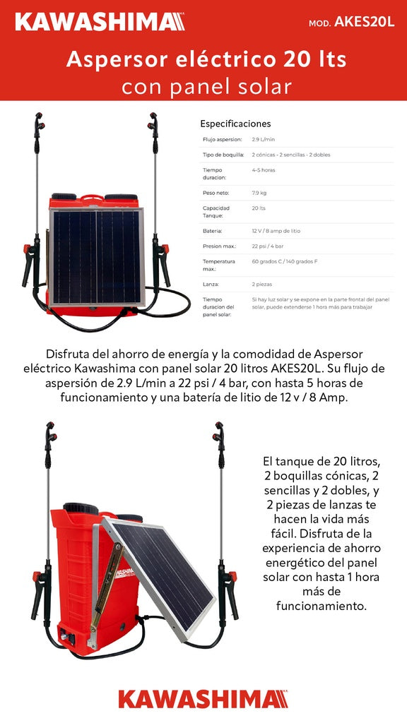 Aspersor eléctrico de 20 litros con panel solar integrado, modelo AKES20L de Kawashima. Diseñado para aplicaciones agrícolas y de jardinería de precisión, combina tecnología solar con sistema de aspersión eficiente. El panel fotovoltaico proporciona autonomía energética, eliminando dependencia de fuentes externas de electricidad. Capacidad de 20 litros permite cobertura prolongada sin recargas frecuentes. Ideal para cultivos, invernaderos y espacios verdes donde se requiere riego controlado y sostenible. Construcción robusta para uso profesional y residencial.