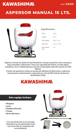 Aspersor manual de 15 litros diseñado para aplicaciones agrícolas y de jardinería. Marca Kawashima KAWA, reconocida por su durabilidad y precisión en la distribución de líquidos. Capacidad óptima para trabajos medianos sin necesidad de recarga constante. Construcción robusta que resiste condiciones de uso intenso. Ideal para aplicar fungicidas, insecticidas, herbicidas y fertilizantes foliares. Ergonomía mejorada para reducir fatiga durante jornadas prolongadas de trabajo. Boquilla regulable que permite controlar el patrón de aspersión según las necesidades del cultivo.