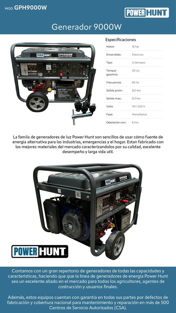 El Generador Power Hunt GPH9000W ofrece una potencia robusta de 9000 W, ideal para aplicaciones industriales, comerciales y residenciales de alta demanda. Con tecnología confiable y construcción resistente, proporciona energía estable para herramientas eléctricas, equipos de construcción y sistemas de respaldo. Su motor de alto rendimiento garantiza eficiencia combustible y operación prolongada. Perfecto para proyectos que requieren potencia sostenida y confiabilidad en condiciones exigentes. Especificaciones técnicas optimizadas para máximo desempeño y durabilidad.