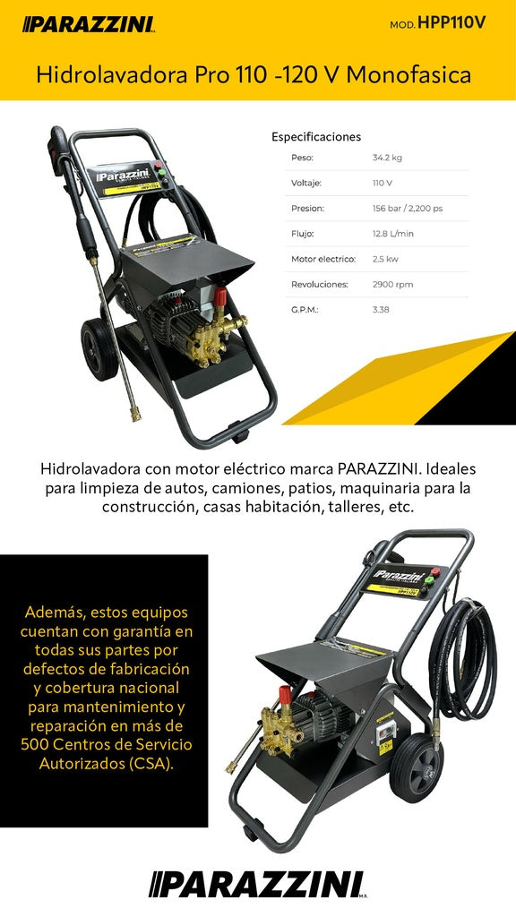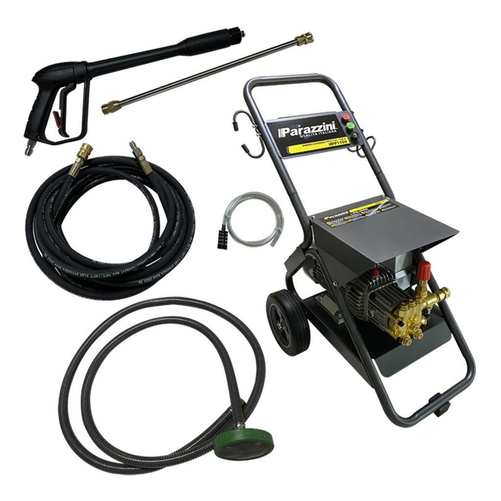 Hidrolavadora de alta presión Parazzini HPP110V diseñada para profesionales que demandan potencia y confiabilidad. Funciona con voltaje monofásico de 110-120V, ideal para talleres, servicios de limpieza y aplicaciones industriales ligeras. Ofrece presión consistente para eliminar suciedad, óxido y residuos en superficies diversas. Su construcción robusta garantiza durabilidad en trabajos continuos. Perfecta para limpiar vehículos, fachadas, maquinaria y espacios exteriores con eficiencia profesional.