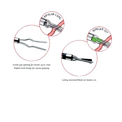La apertura de las pinzas de 8.5 mm para vasos de hasta 7 mm.  Pinzas rectas de 5 mm y 10 mm. Pinzas rectas de 5 mm y 10 mm.  La cuchilla para corte bipolar es un electrodo.