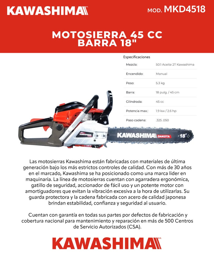 Motosierra 45 cc barra 18 pulg. Kawashima Dakota MKD4518