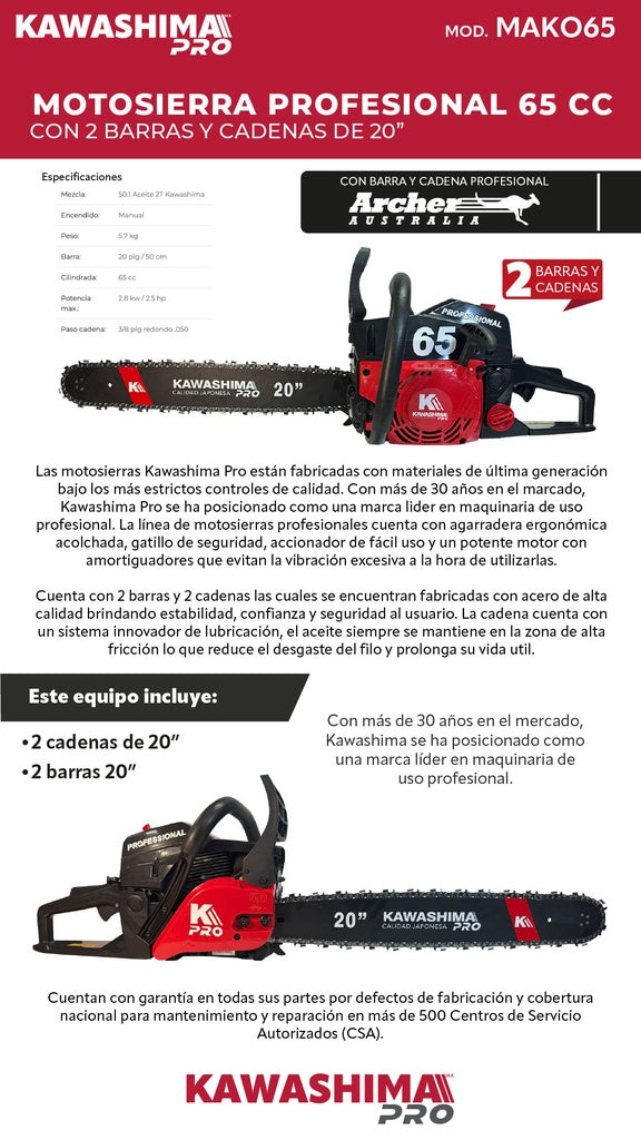Motosierra profesional 65 cc con 2 barras y cadenas de 20 pulg Kawashima Pro MAKO65