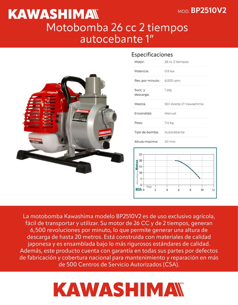 Motobomba 26 cc 2 tiempos autocebante 1 pulg Kawashima BP2510V2