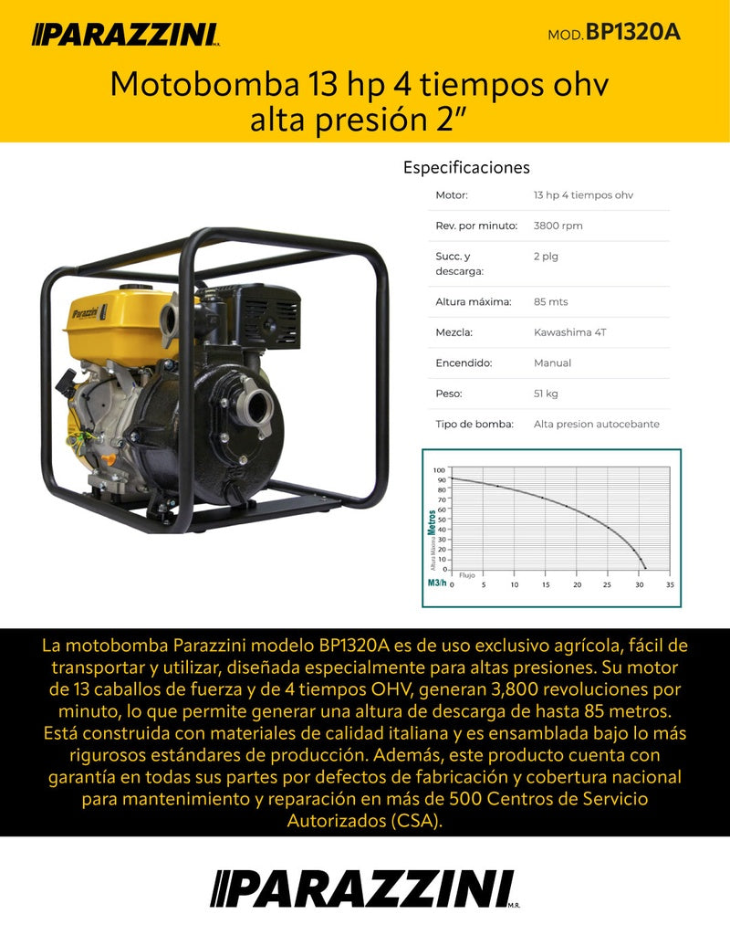 Motobomba de alta presión Parazzini BP1320A con motor de 13 HP y 4 tiempos OHV. Diseñada para aplicaciones agrícolas e industriales que requieren desplazamiento potente y confiable. Descarga de 2 pulgadas permite manejar caudales significativos con presión consistente. Motor OHV garantiza eficiencia térmica superior y menor consumo de combustible. Ideal para riego, drenaje y transferencia de líquidos en terrenos exigentes. Construcción robusta para operación continua en condiciones difíciles.
