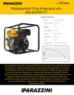 Motobomba 13 hp 4 tiempos ohv alta presion 2 pulg Parazzini BP1320A