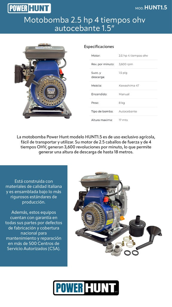 Motobomba 2.5 hp 4 tiempos ohv autocebante 1.5 pulg Power Hunt HUNT1.5