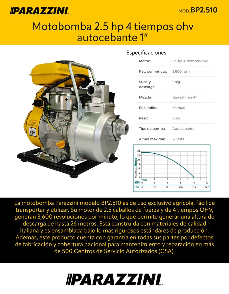 Motobomba 2.5 hp 4 tiempos ohv autocebante 1 pulg Parazzini BP2.510