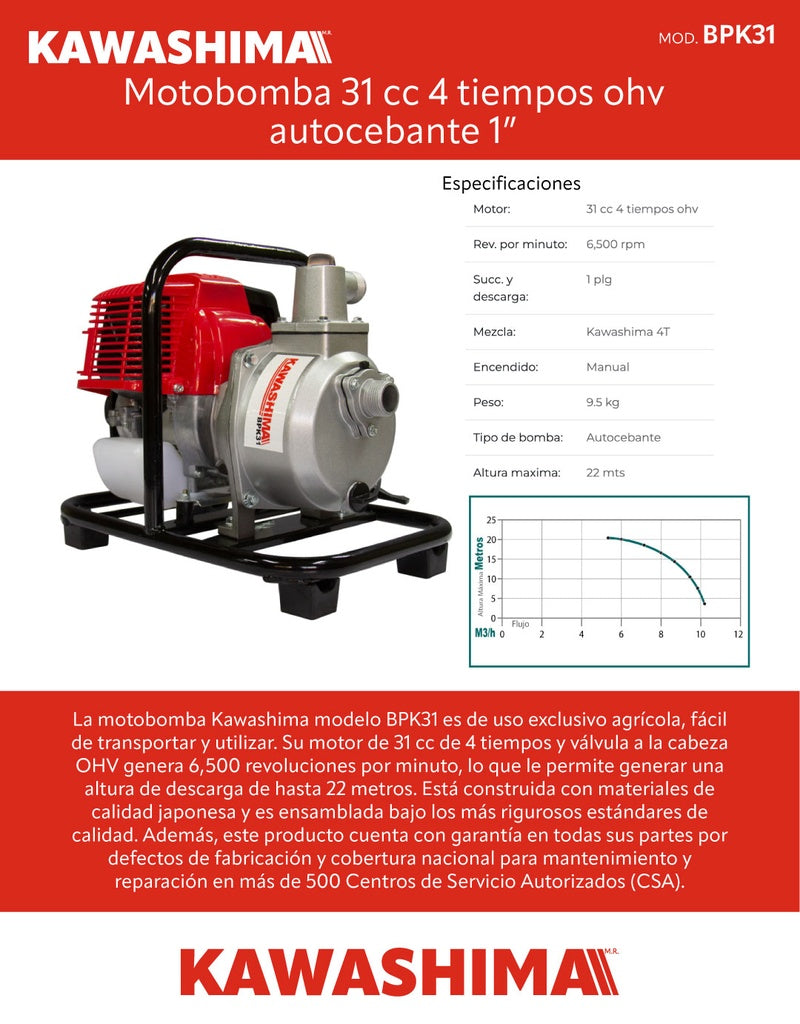 La Motobomba Kawashima BPK31 es una solución confiable para transferencia de agua en aplicaciones agrícolas e industriales. Equipada con motor de 31 cc de 4 tiempos OHV, ofrece eficiencia combustible y bajo mantenimiento. Su sistema autocebante permite cebado automático, eliminando la necesidad de llenar manualmente la bomba antes de cada uso. Con descarga de 1 pulgada, se adapta a tuberías estándar para flujos moderados. Ideal para riego, drenaje y circulación de agua en terrenos con variaciones de nivel. Construcción robusta diseñada para operación continua en condiciones exigentes.