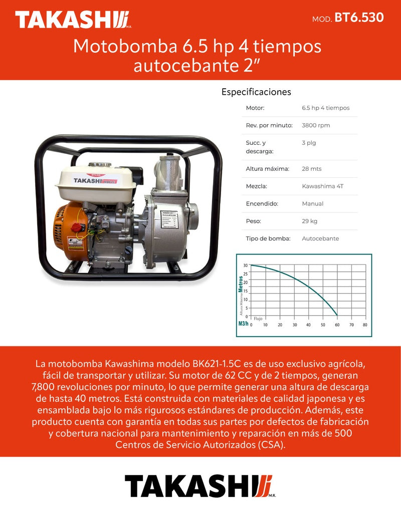 Motobomba 6.5 hp 4 tiempos autocebante 3 pulg Takashi BT6.530