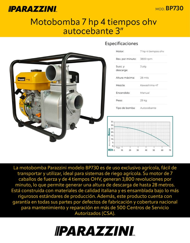 Motobomba 7 hp 4 tiempos ohv autocebante 3 pulg Parazzini BP730