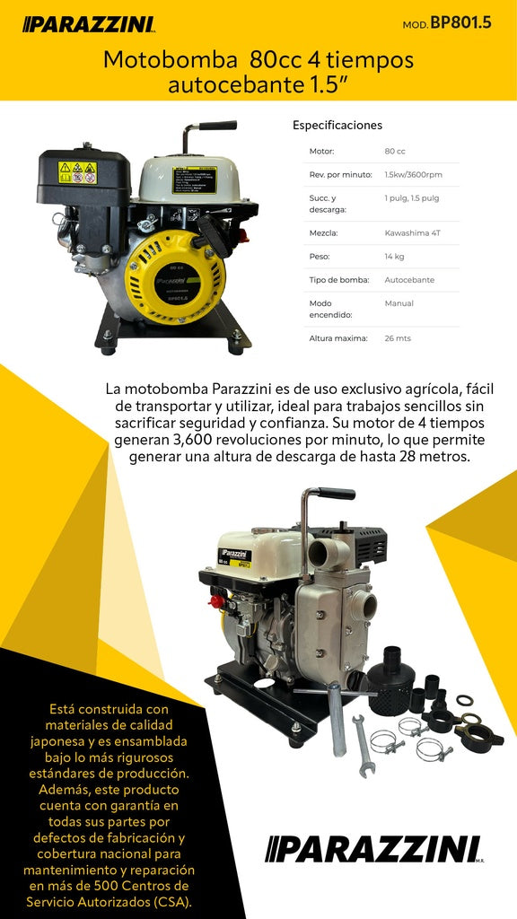 Motobomba 80cc 4 tiempos autocebante 1.5 pulg Parazzini Pro BP801.5