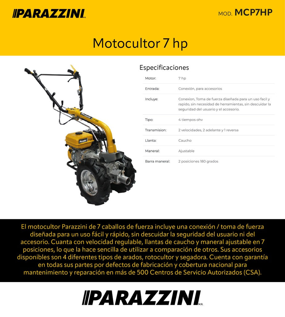 El motocultor Parazzini de 7 caballos de fuerza incluye una conexión / toma de fuerza diseñada para un uso fácil y rápido, sin descuidar la seguridad del usuario ni del accesorio. Cuanta con velocidad regulable, llantas de caucho y maneral ajustable en 7 posiciones, lo que la hace sencilla de utilizar a comparación de otros. Sus accesorios disponibles son 4 diferentes tipos de arados, rotocultor y segadora. Cuenta con garantía en todas sus partes por defectos de fabricación y cobertura nacional para mantenimiento y reparación en más de 500 Centros de Servicio Autorizados (CSA).