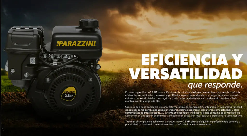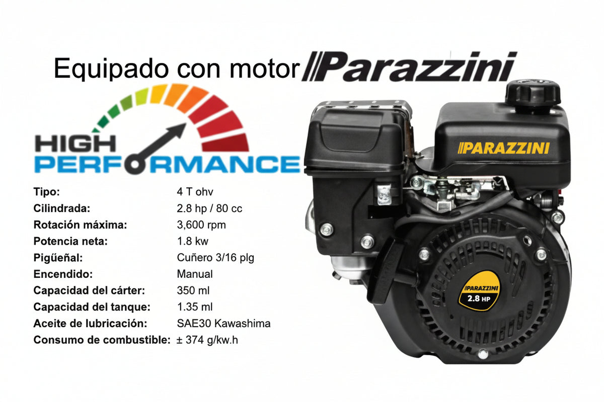El Motor Parazzini MP2.8 es una unidad de potencia confiable y versátil diseñada para ofrecer rendimiento eficiente en múltiples aplicaciones agrícolas, industriales y de trabajo ligero. Con una cilindrada de 97 cc y una potencia de 2.8 HP, este motor a gasolina de 4 tiempos combina fuerza compacta, bajo consumo de combustible y un funcionamiento suave.
