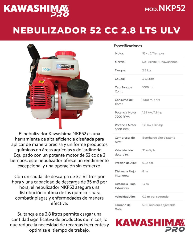 El Nebulizador 52 cc 2.8 Lts ULV Kawashima Pro NKP52 es un potente equipo para la pulverización de líquidos. Con una capacidad de 2.8 litros, este nebulizador es ideal para grandes áreas. Además, su motor de 52 cc ofrece una excelente potencia y su tecnología ULV asegura una difusión uniforme y eficiente del producto.