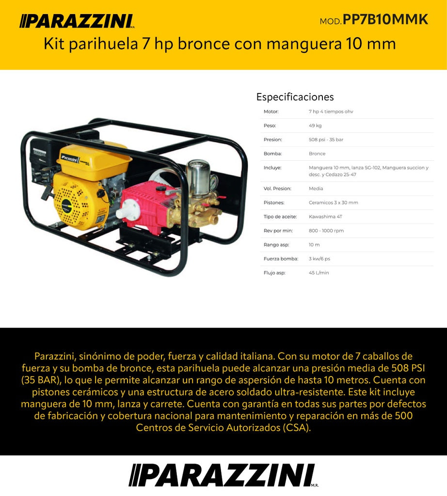 Obtén fácilmente el nivel de presión adecuado con el Kit parihuela 7 hp bronce con manguera 10 mm Parazzini PP7B10MMK. Con una potente bomba de 7 caballos de fuerza y una manguera resistente de 10 mm, podrás realizar tus tareas con eficiencia y precisión. ¡Ideal para uso profesional en la industria!