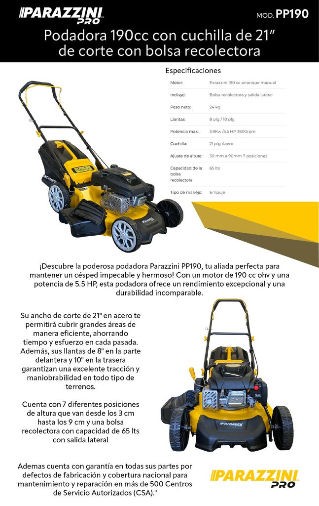 Podadora 190cc con cuchilla de 21 pulg de corte con bolsa recolectora Parazzini Pro PP190