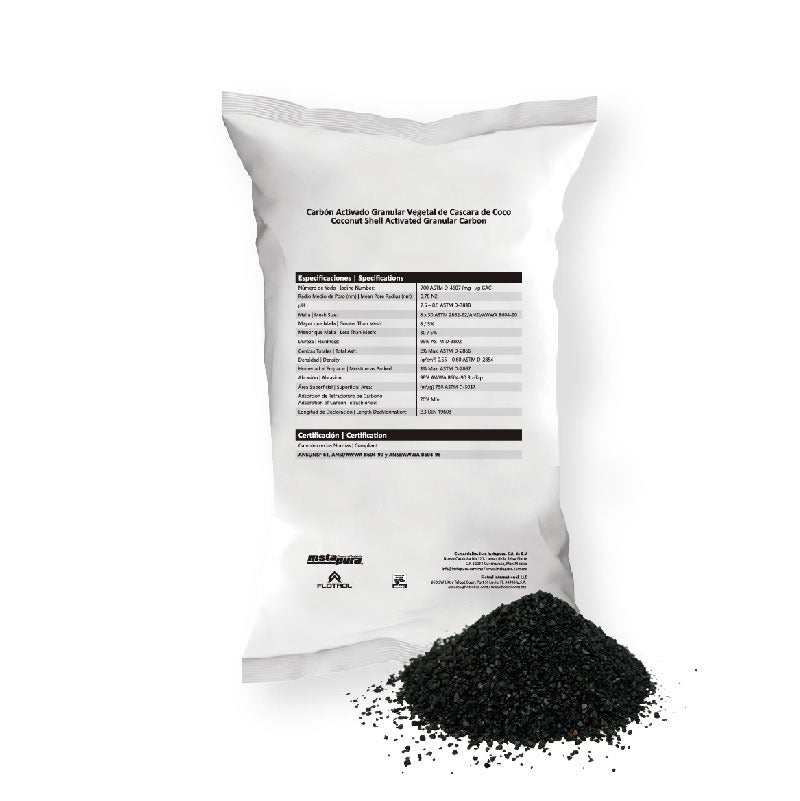 Carbón activado granular de cáscara de coco, especialmente diseñado para aplicaciones de filtración en sistemas residenciales, comerciales e industriales. Presenta malla 8x30 con dureza superior del 99%, garantizando resistencia y durabilidad en procesos de purificación de agua y aire. Cada saco contiene 12.4 kg de medio filtrante de alta calidad, ideal para reemplazos y mantenimiento de filtros. Su estructura porosa maximiza la capacidad de adsorción, eliminando impurezas, cloro, olores y sabores indeseables. Perfecto para sistemas de tratamiento de agua potable, depuración industrial y aplicaciones de control de contaminantes. Material 100% vegetal, ecológico y reutilizable. Compatible con diversos sistemas de filtración y fácil de instalar en cartuchos y lechos filtrantes.