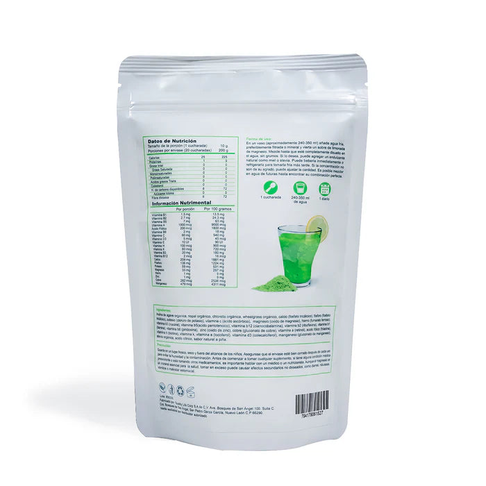 Inulina de agave, nopal, chlorella (clorela), wheatgrass (pasto de trigo), calcio (fosfato tricálcico), hierro (fumarato ferroso), vitamina B3 (niacina), vitamina B5 (ácido pantoténico), vitamina B12, (cianocobalamina), vitamina B2 (riboflavina), vitamina B1 (tiamina), vitamina B6 (piridoxina), zinc (óxido de zinc), cobre (gluconato de cobre), vitamina A (retinol), ácido fólico (folacina), vitamina H (biotina), vitamina K, vitamina E (tocoferol), vitamina D3 (colecalciferol), manganeso (gluconato de manganeso), stevia, ácido cítrico, sabor natural a piña.