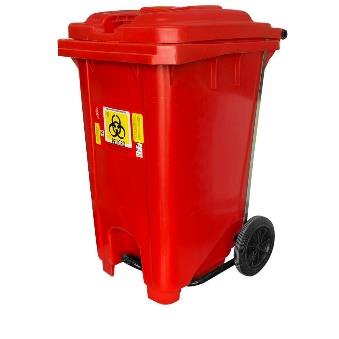 Bote de basura grande con pedal y ruedas, en color rojo y etiquetado para RPBI (Residuos Peligrosos Biológico-Infecciosos).