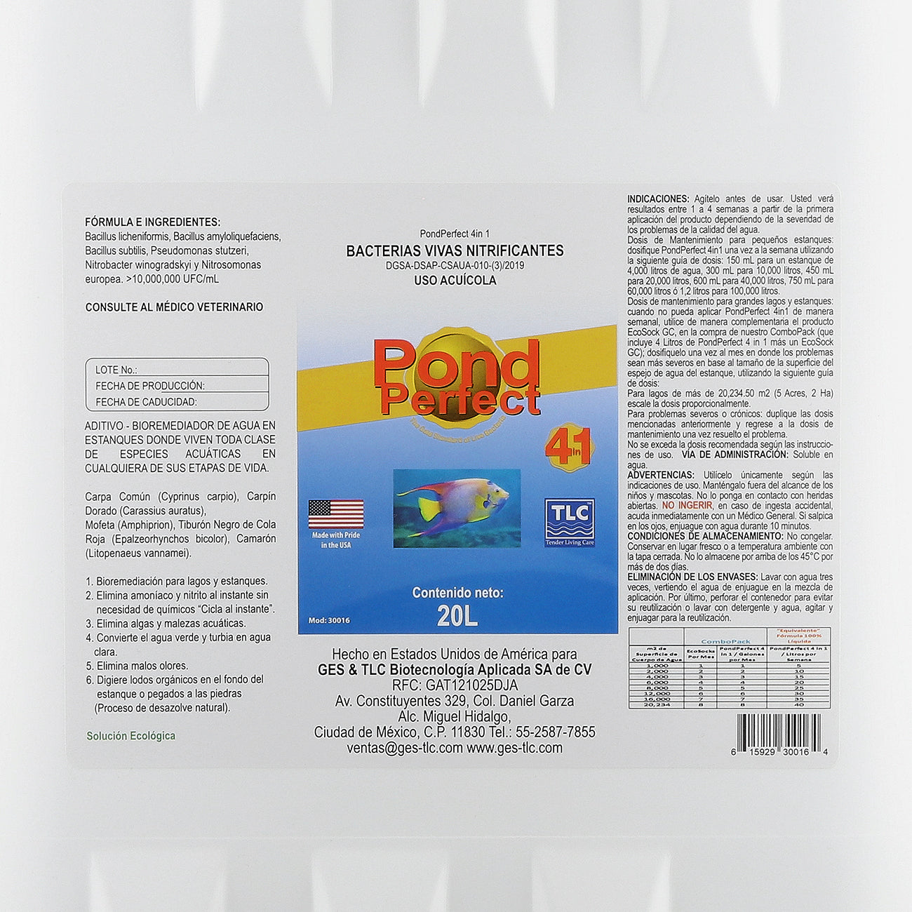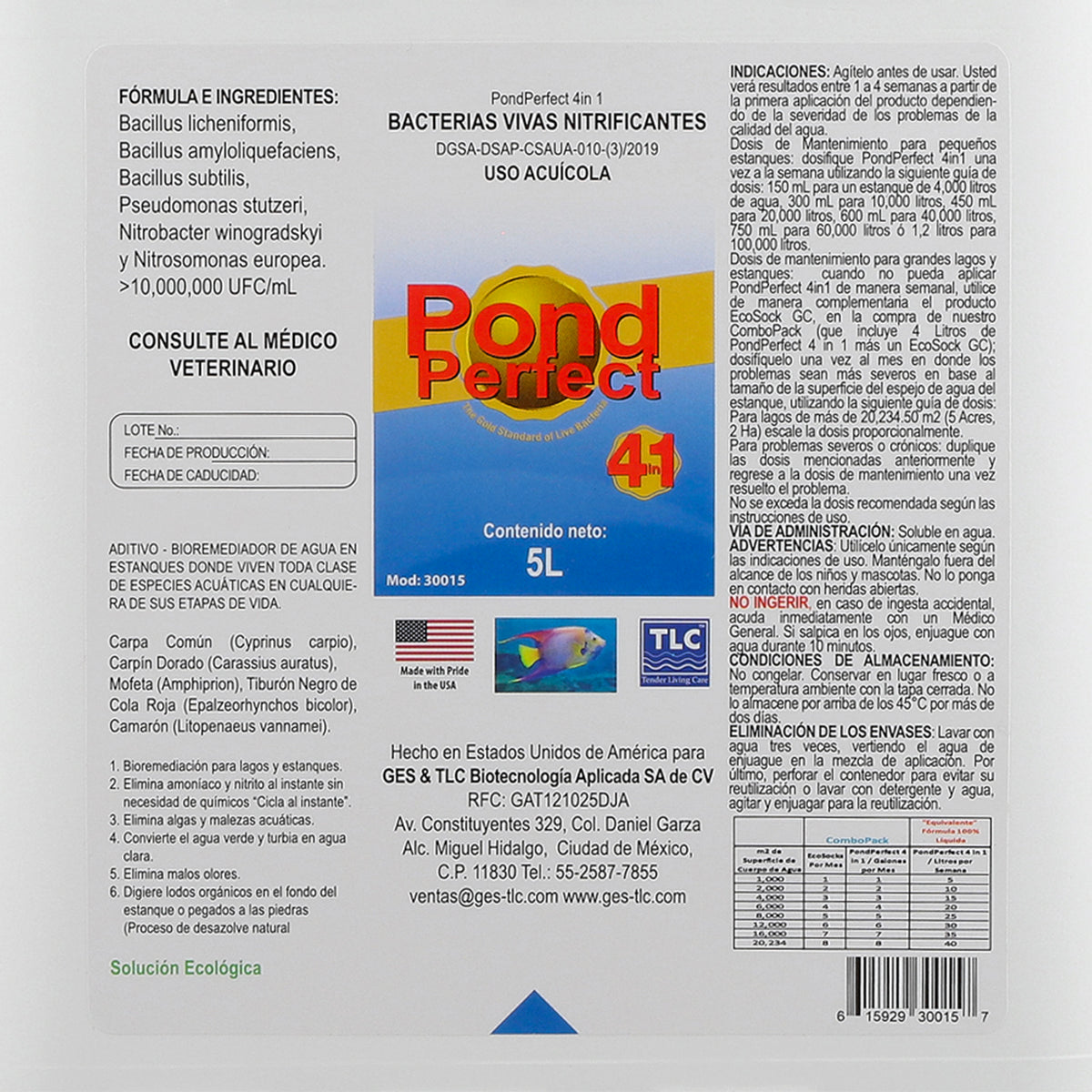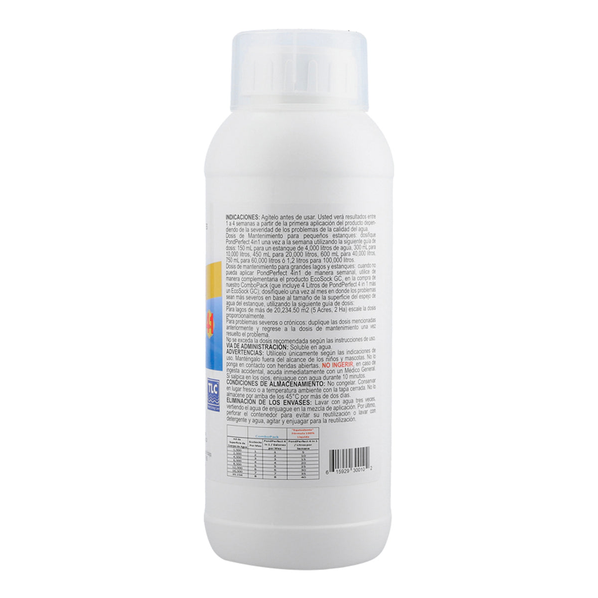 Dosis: Dosifique 5 litros de PondPerfect 4 en 1 por cada 1000 m2 de superficie de espejo de agua una vez por semana.