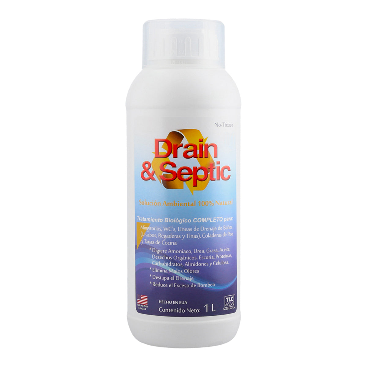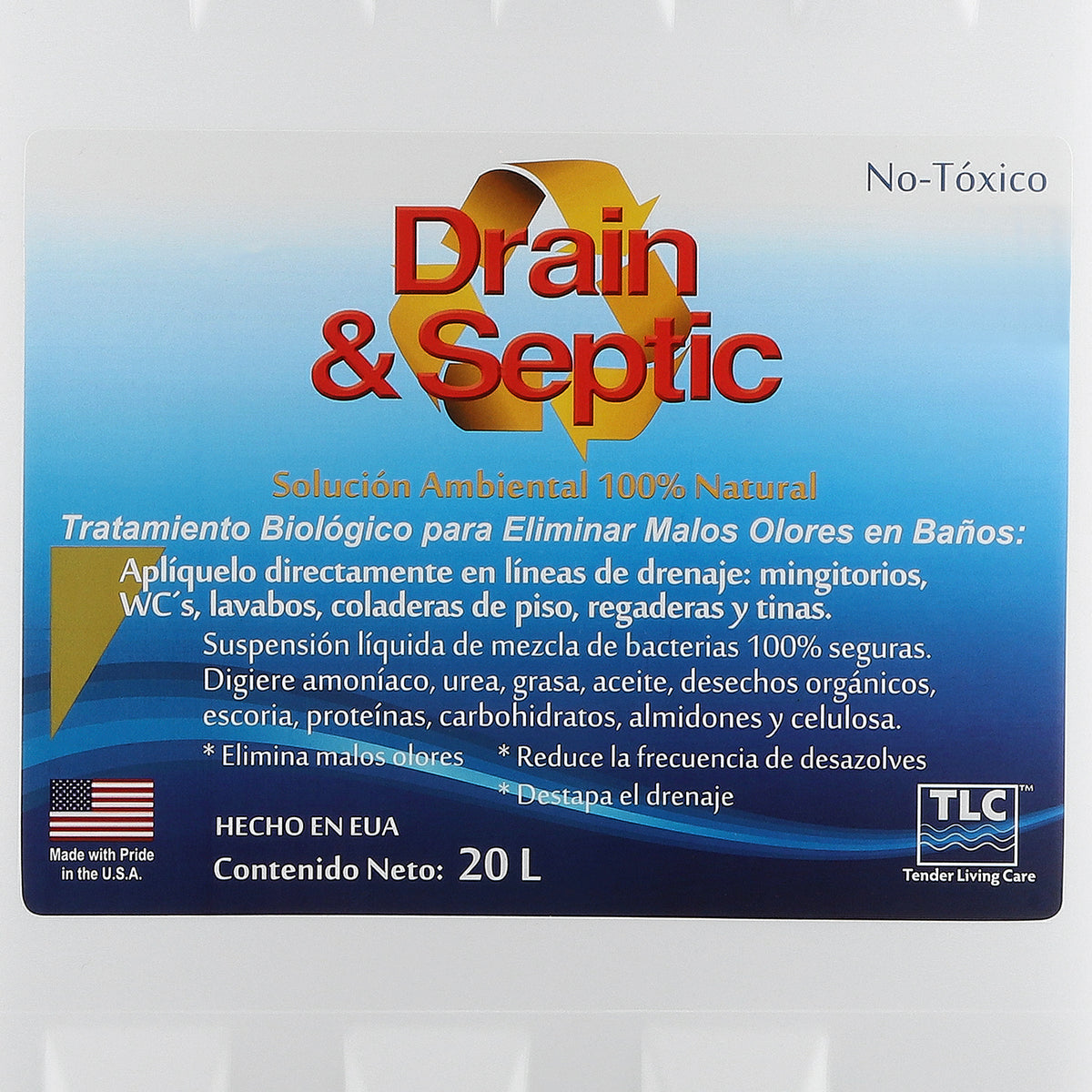 Drain & Septic es una suspensión líquida de mezcla de bacterias nitrificantes vivas y activas digestoras de amoniaco y urea, lo cual mejora la nitrificación y la remoción general de demanda química de oxígeno, así como mezcla de bacterias vivas y activas altas productoras de exoenzimas incluyendo lipasa, amilasa y proteasa, capaces de solubilizar y digerir grasa, aceite, lodos, proteínas, carbohidratos, celulosa y almidón a través de un procedimiento de alta solubilización de materias coloidales y partículas en el tratamiento de aguas residuales, generadas por las descargas de aguas residuales en cocinas, núcleos de baños, registros de drenaje, cárcamos y plantas de tratamiento biológicas de aguas residuales, con el objeto de mejorar la calidad de los efluentes y por consecuencia disminuir al mínimo olores sulfurosos, así como mejorar la estabilización de lodos, reducir la producción de lodos activados y los trabajos de limpieza ocasionados por obstrucciones en cañerías y drenajes.