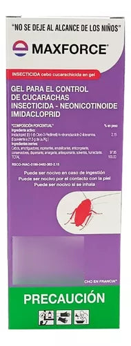 Maxforce 30 gramos de Bayer, cebo en gel para el control de cucarachas, de uso doméstico y comercial. Actua por ingestión por lo que los puntos de cebo deben ponerse en lugares donde la cucaracha pueda consumirlo.