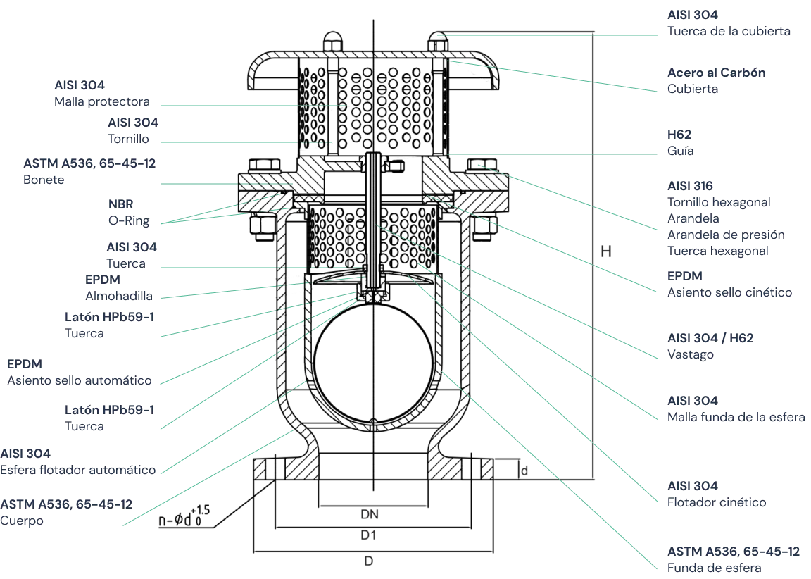 Válvula de admisión, expulsión y eliminadora de aire en un mismo cuerpo de hierro dúctil 250 CWP Marca RUD FIG. DAEX de 4"