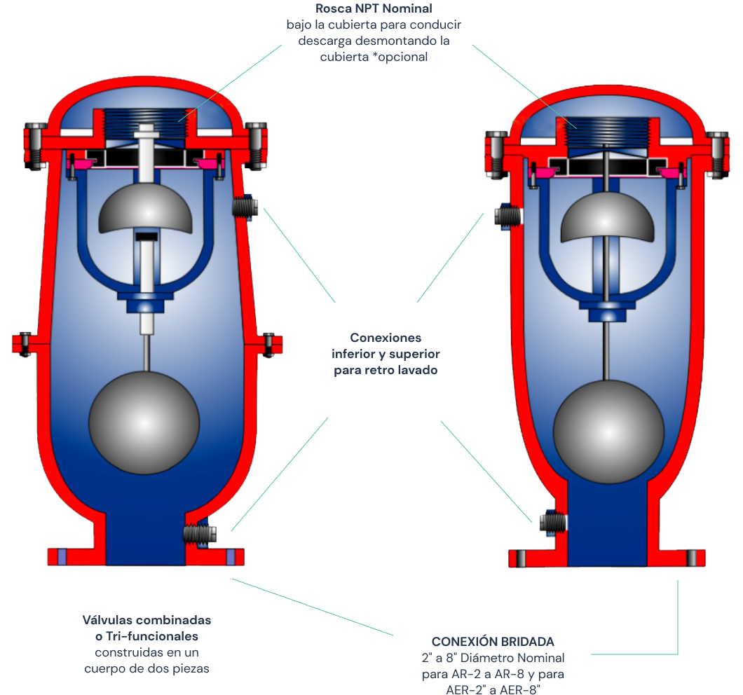 Válvula que admite aire para evitar vacío en la línea y expulsa el aire a medida que el fluido va llenando la línea hasta cerrar la válvula purgando el aire que se va formando en la línea de agua residual.
