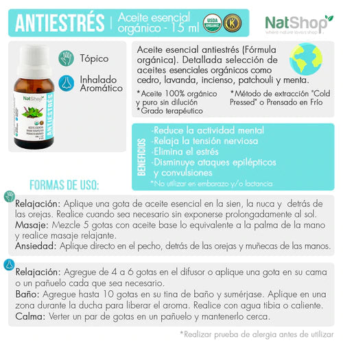 - Masaje: Mezcle 5 gotas con aceite base lo equivalente a la palma de la mano y realice masaje relajante.