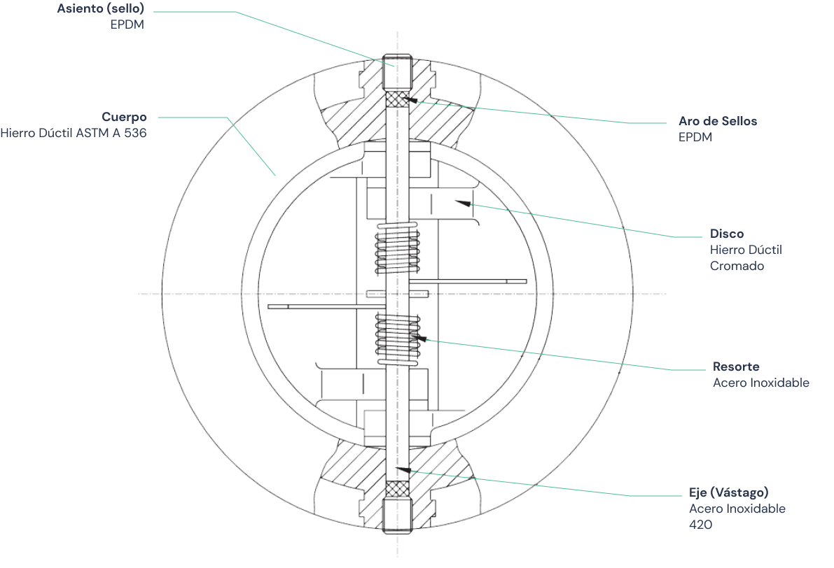 Válvula de diseño tipo wafer de disco bipartido que permite el flujo en una sola dirección, evitando el contraflujo en la línea.