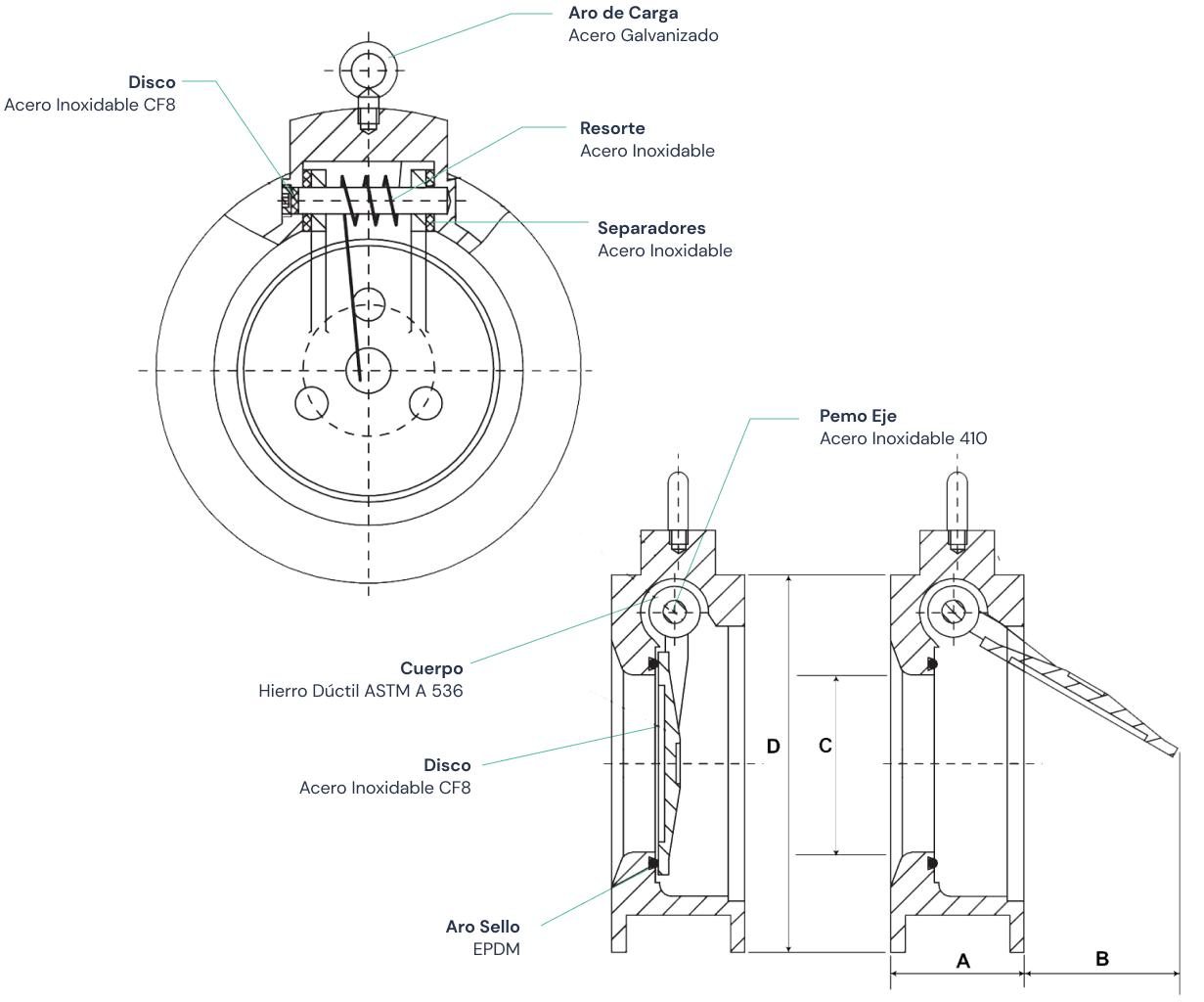 Válvula de diseño tipo wafer de disco único de acero inoxidable que permite el flujo en una sola dirección, evitando el contraflujo en la línea.